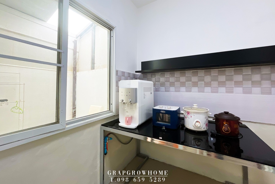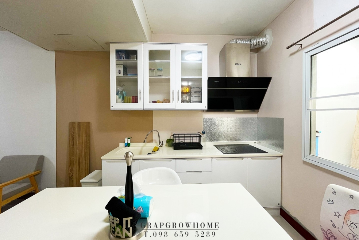 – 1 ห้องครัวฝรั่งพร้อมเค้าเตอร์ครัวและพื้นที่เตรียมอาหาร เครื่องดูดควัน เตาไฟฟ้า